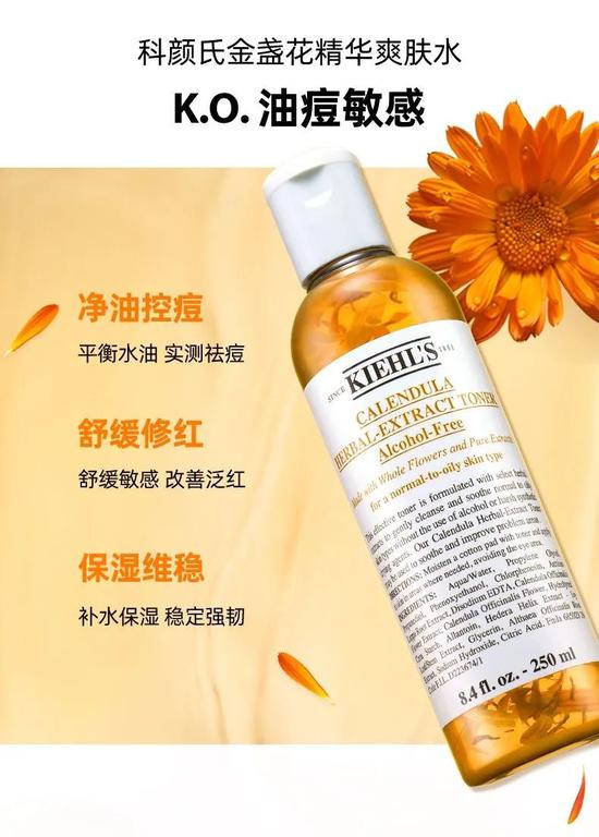 这款金盏花爽肤水由精选的草本萃取配置而成,取自金盏花卉及其它天然植物精华,蕴含牛蒡提取物和药蜀葵提取物。