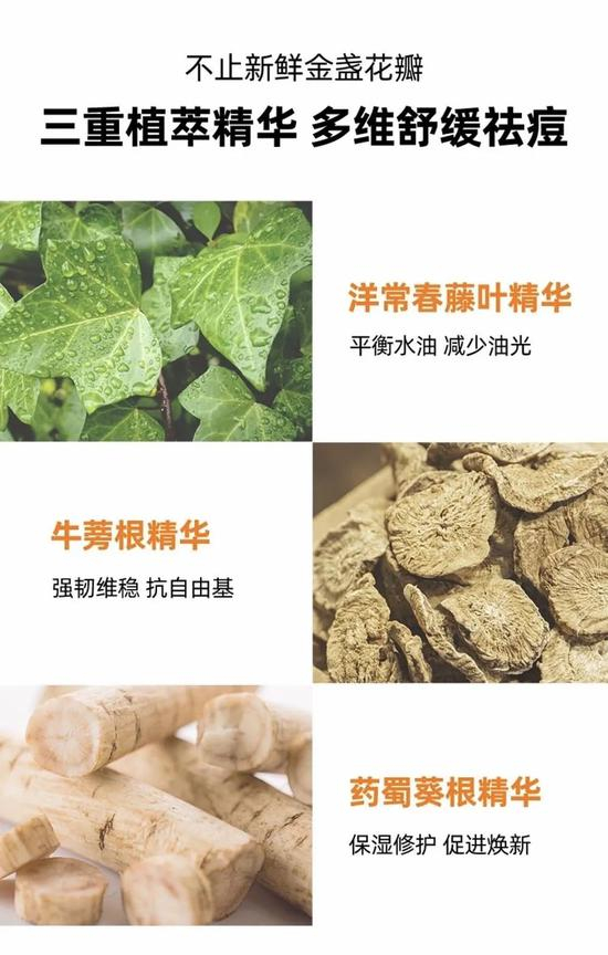 质地非常清爽,上脸丝毫没有粘腻感,拍完之后清清爽爽。偶尔脸上冒出红肿的痘痘,在睡前用金盏花进行湿敷,两三天痘痘就会被消灭!