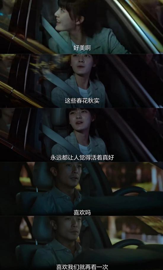 文淇饰演的邱冬娜透过车窗看到路边的树与光影,感叹春华秋实让人觉得活着真好,邱泽饰演的顾飞听了之后立马打了转向灯调头陪她再看了一次。