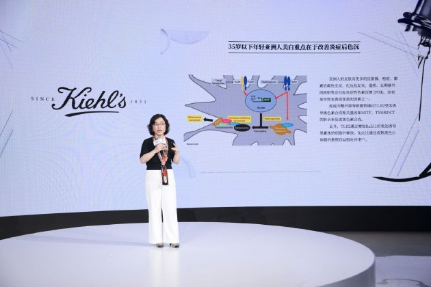 ▲ 欧莱雅中国研发和创新中心护肤品开发实验室总监许宫绮女士在会上分享Kiehl‘s科颜氏安白瓶淡斑精华的配方科技