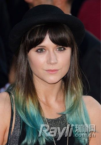 额前刘海略微分开形成圆润弧度,披肩发发梢利用褐色浅蓝至深蓝色的过度色进行拼染,独具匠心的染发搭配爵士圆礼帽颇具艺术气质。