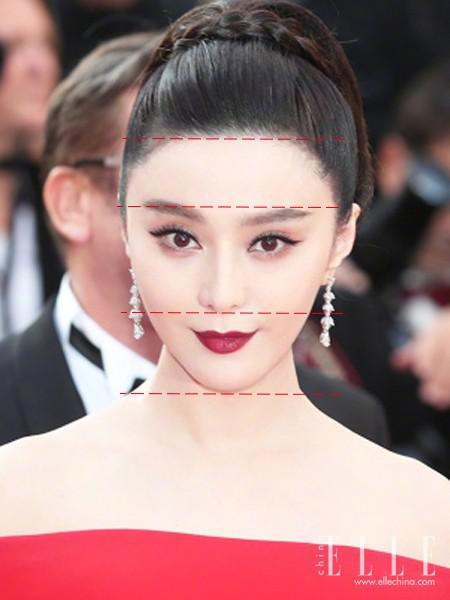 而通过对比线能看出,范冰冰的额头是以上三个距离中,最短的,这样面部的比例有些失调,再如此全部暴露出来自然就显得不够好看。不过额头短只是范冰冰露额头不够好看的原因之一。