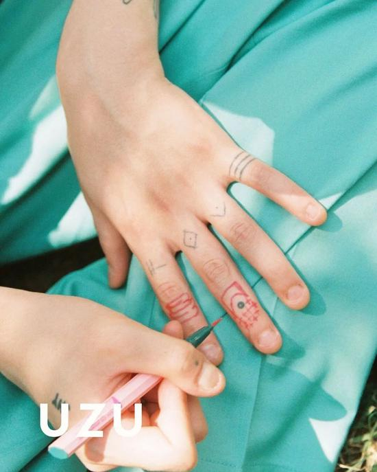 UZU BY FLOWFUSHI的各色眼线笔绘制出有趣的图案,和吴赫身上的文身和谐地融合在一起。在阳光的沐浴下,温暖而迷人。