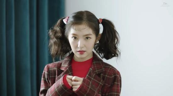 另外,俏皮双马尾的出现,让本来就年轻的Irene看着更小了;而小学生发夹,在如此合适的场合怎么会缺席呢?