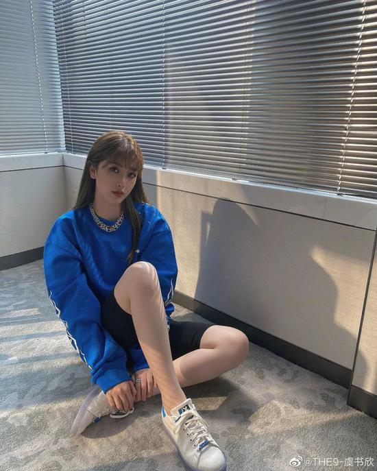落肩卫衣搭配骑行裤,上宽下窄,显头小显腿细。