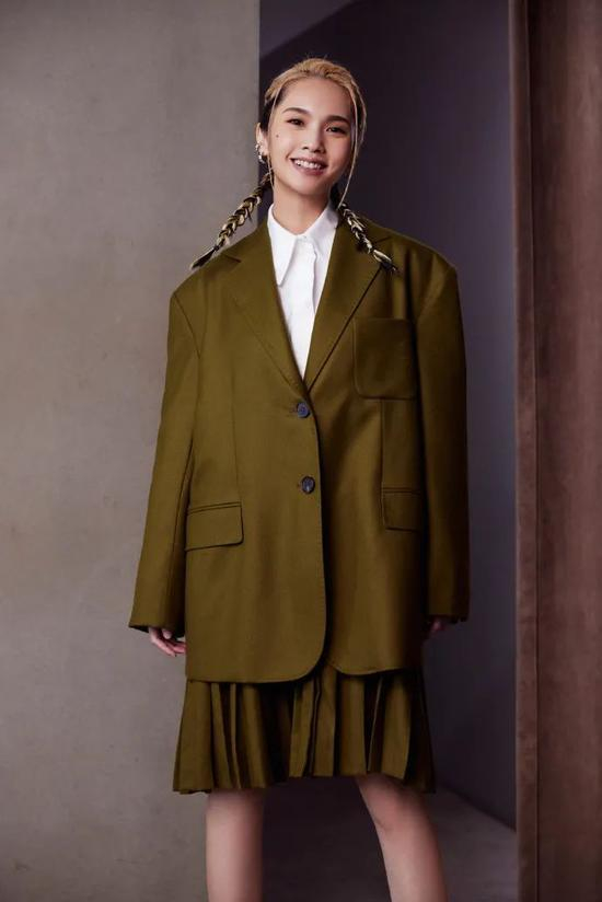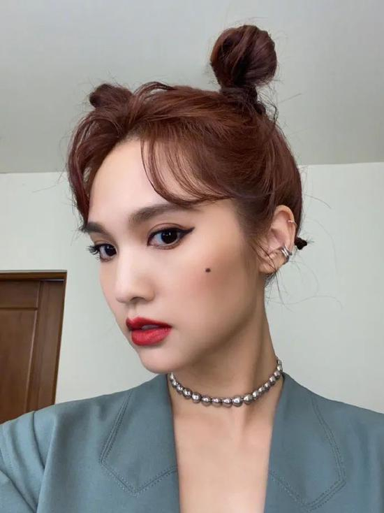 不仅视觉上拉长了整个脸部的线条,显得脸小了好多,还成功撕掉了“可爱教主“的标签~