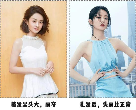 所以,像这样窄肩、头围比较大的姑娘是不建议披发的,会显得头重脚轻。最好的办法就是扎起来,别让视线集中在肩部。