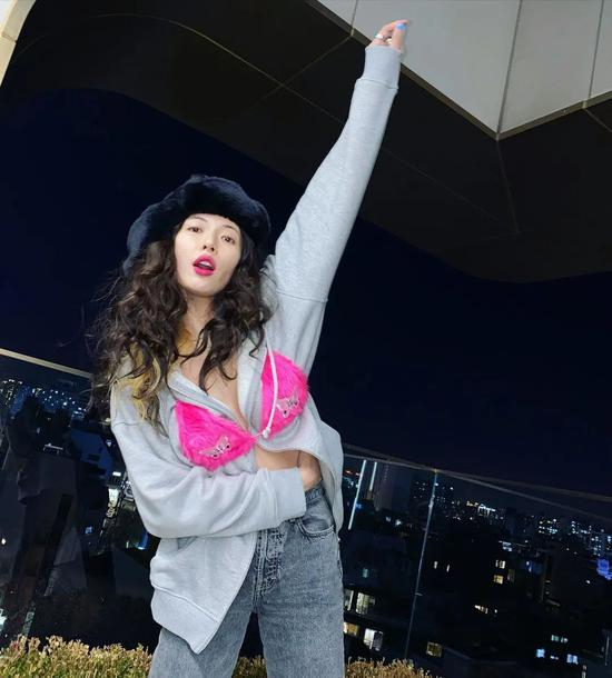 继续保持黑色直刘海不变,其他地方变卷发。配上泫雅的标志性玫红色口红,涂满,运动外套外面套玫红色毛绒bra,与口红做了呼应。不过这搭配只能由酷女孩来执行,今晚走性感潮流风。对啦,别忘了在眼下点一颗痣哦。