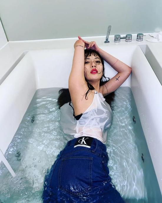 太爱这湿发造型了吧!虽然在我的眼里没有不好看的湿发造型,但这个也太可了。无比性感的湿发、红唇,但手臂上的小学生文身,又透露着可爱的气息。重点是这浓而不厚重的眼睫毛,点睛之笔!