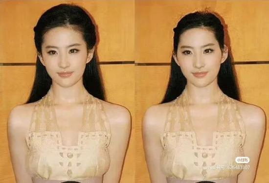 不信你们看这是Ps修改过头发的神仙姐姐,可以明显感觉到,虽然右边图片只减掉了点头发,但是却感觉头发少的那边,神仙姐姐的脸好像大了一圈!