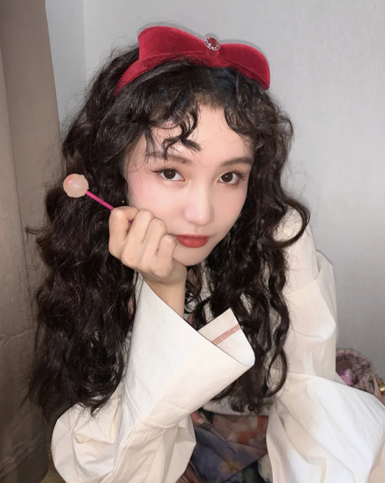 刚才提到横卷有横向扩宽的效果,圆脸本身已经很有膨胀感,最好选择自然松散的竖卷。