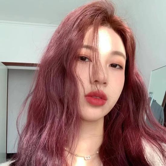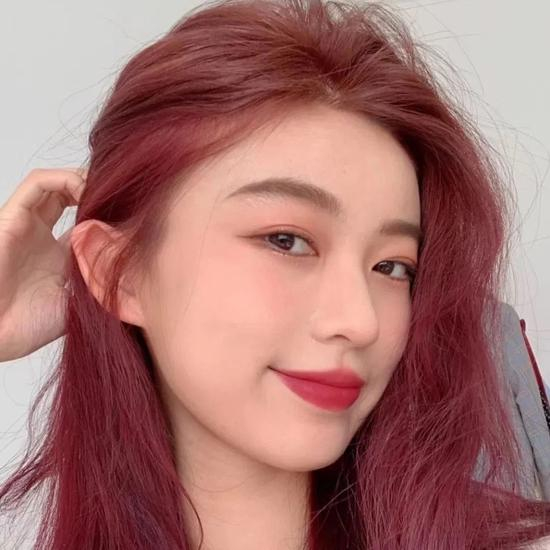 莓果红就比较正常一些啦,是一款不用漂就能直接染的颜色,在暗的光线下是暗红色调,在亮光下就是韩系女团发色了,特别耐看!