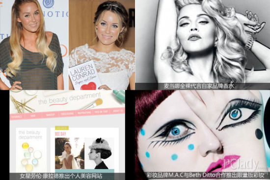 再讲回这些频繁为美妆代言的女星,也有人朝着更专业的路线发展,如女星Lauren Conrad(劳伦·康拉德)建立个人美容网站,分享与论坛个人美容方面的小秘诀,去年个人挑染的发型也得到了很多媒体的报道,同时她又出了美容书,并在国际美容专业杂志分享了自己的美容心得,据悉她也准备在条件相对成熟后,开创自己的美容、美发品牌。性感女星麦当娜也十分豁得出去,全裸为自家品牌代言,自己的品牌格外卖力也是情理之中,而与MAC合作的Beth Ditto,则在彩妆的设计上放上了十足的自我个性,去年6月推出的带有波点的夏日彩妆一经推出也收获了不错的市场反响。