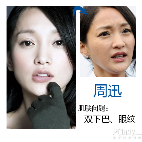 可以看到在写真照中周迅的肌肤白嫩得像豆腐一样,平滑细腻充满光泽。可是当看到去除了PS后的现场照片,发现她的肌肤问题不止是一点点啊。首先紧蹙的眉头让干燥的眼周布满了细纹,眼袋也愈发明显。其次松弛的肌肤导致双下巴很严重,这也充分说明不仅仅的瘦子才会拥有双下巴,只要你保养不得当,双下巴依然会找上门。