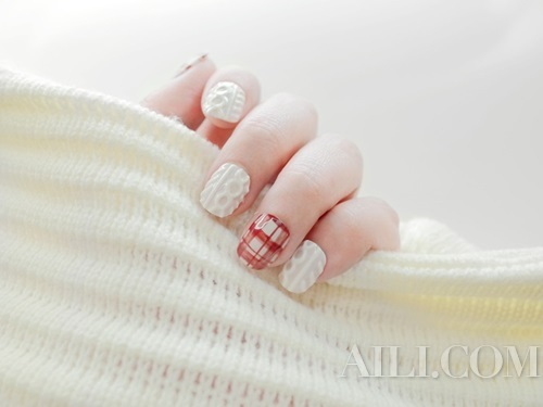 立体浮雕的方式在指尖上勾勒出毛衣的麻花纹路,配上红格子的百搭格纹。十分俏皮可爱。
