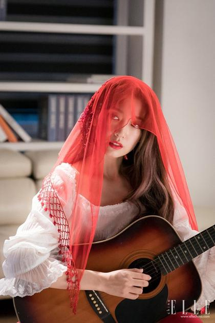 蒙红纱弹吉他时则是更加鲜明的红唇,这样配上白纱裙更加吸睛显白了。