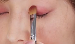 1、用轻柔的红色系眼影打底,均匀地在眼皮上方晕染开来。