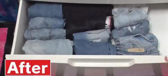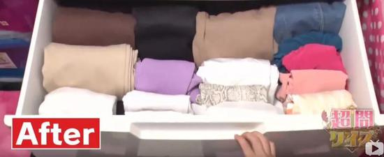 日本式的收纳秘籍就是:要立起来!堆叠式的平铺法占用了一柜子的空间,而立起来后,仅仅占用了一半的空间。