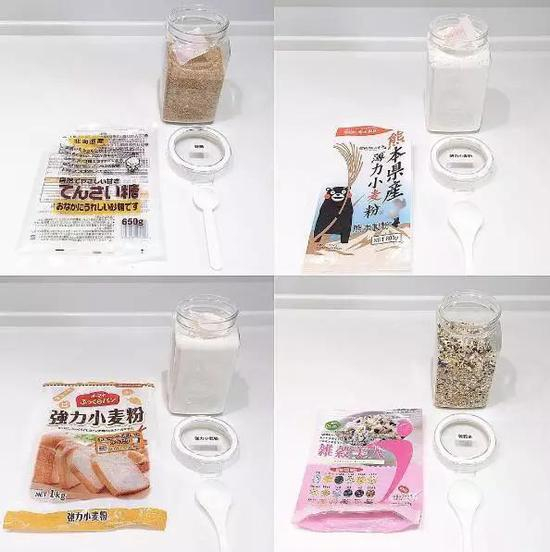 像小麦粉、砂糖、杂粮一类的食品需要防潮保存的,装进玻璃瓶中贴好标签。