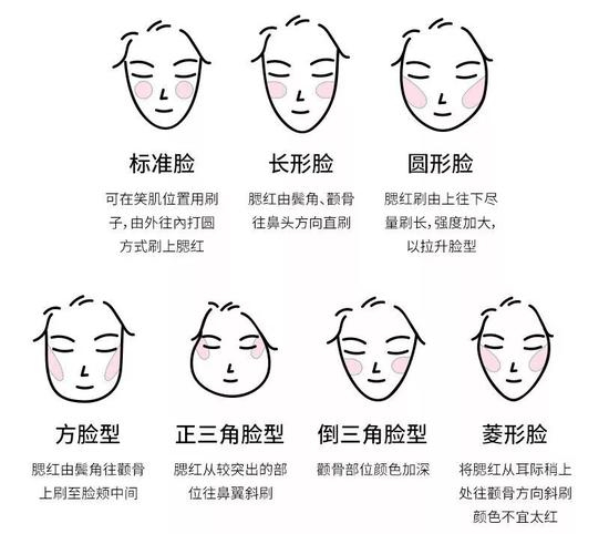 所以不光是高光和阴影有修容的作用,我们腮红也有嗷,阿九帮你们整理了一下,不同脸型对应腮红该画的位置,拿好不谢。👇
