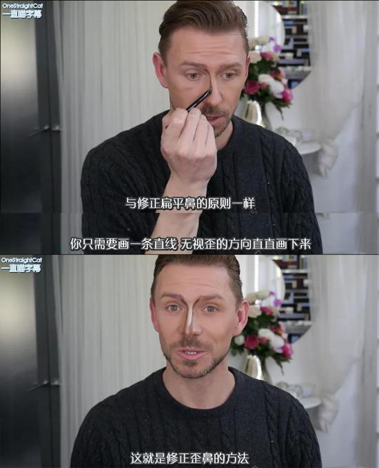 普通人的鼻子大部分都会有一点歪,采用和扁平鼻差不多的修容方式。