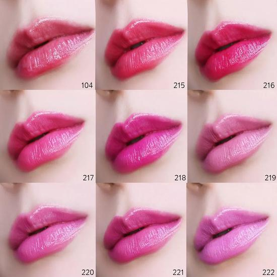 #104是清透的唇蜜质地,可以最大限度的呈现嘴唇本身的颜色;#215〜222显色偏自然,适合本身唇色浅的小可爱;#309〜316的发色就比较浓郁啦,仿佛每一支都写上了春天的名字~