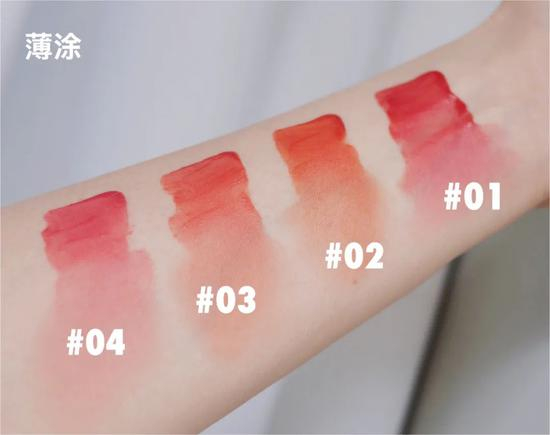 唇釉是水状质地,不黏不厚重,非常轻盈,有非常淡的奶油香气,不腻人。成膜快,完全干掉之后不沾杯不沾口罩,轻若无物,日常上班或者出门约会吃饭用都很ok!