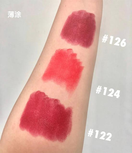 因为Zoe的肤色和唇色偏深,所以她设计的颜色,都很明亮很性感还能提亮肤色的颜色,这次我也选了我比较喜欢的#122、#124、#126这三款颜色给大家做试色。