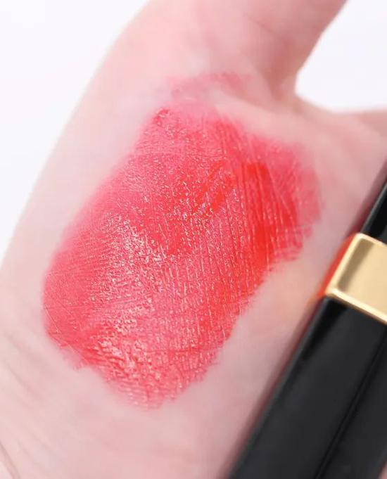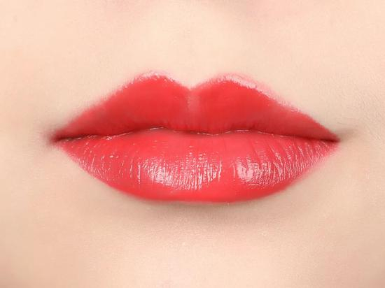 薄涂能看出来粉色,和橘色糅合一下就是鲜亮的草莓红,蛮妙的,厚涂是存在感超强的水橘红,镜面妆效很好看啊,显白很显白!