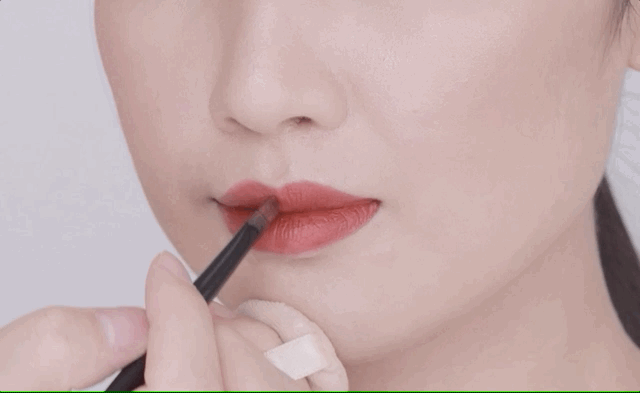 再使用铁锈红色唇膏叠涂晕染于唇心,打造多层次的薄雾咬唇妆。