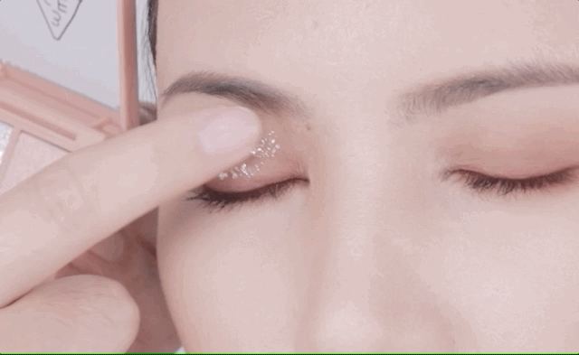 手指沾取少量白色珠光亮片,点缀于眼部,让眼妆更加闪耀。