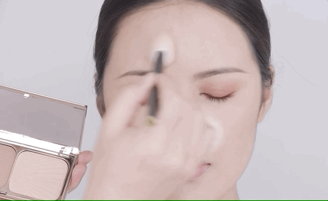 高光色提亮额头、T区、苹果肌以及脸部内侧。