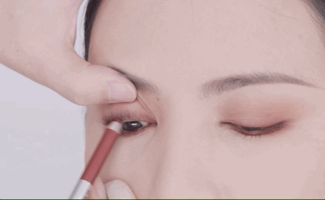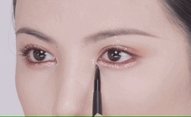 使用珠光玫红色眼线笔晕染于睫毛根部,画出美瞳线。