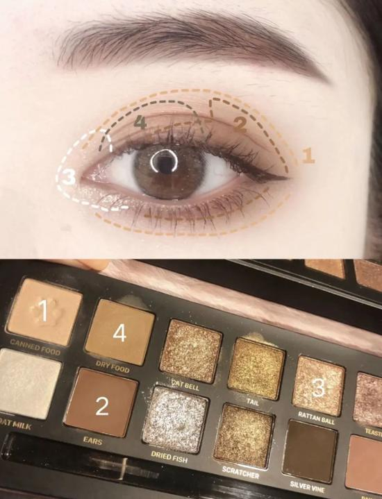 如果感觉妆容有点脏,可以用刷子蘸取最浅色反复晕染眼妆边界,眼妆不干净也可以得到明显改善。