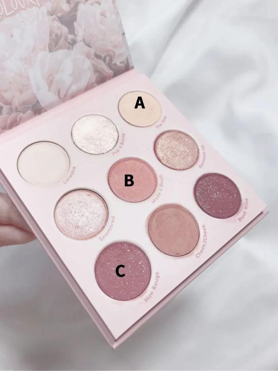 眼影操作起来没啥难度,用最浅色大面积打底,再把中间最嫩的樱花色平铺在上下眼睑,最后用深色系压一下眼尾,营造一个粉糯糯的眼妆氛围,眼影部分就结束了~