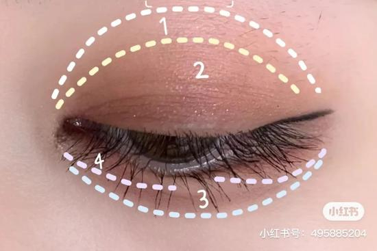 打底就用最浅色、双眼皮褶子用中间色,最深色涂在眼尾和睫毛根部,然后用提亮色点在眼皮中央和眼头作为点睛之笔。