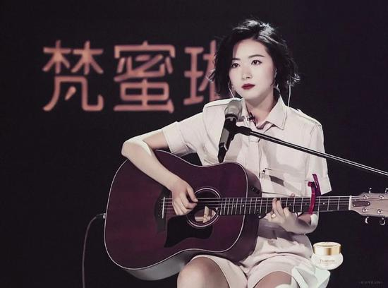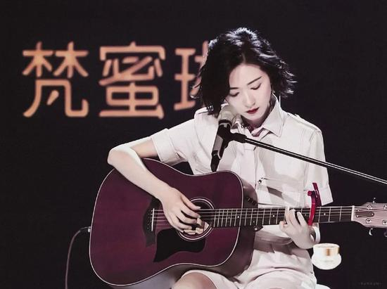 万茜则选择了淡粉色西装短裤套装,发型是蓬松的栗色锁骨短发,坐在台上自弹自唱《敬你》时的模样,真的少年感十足,