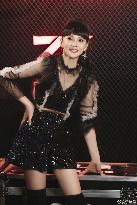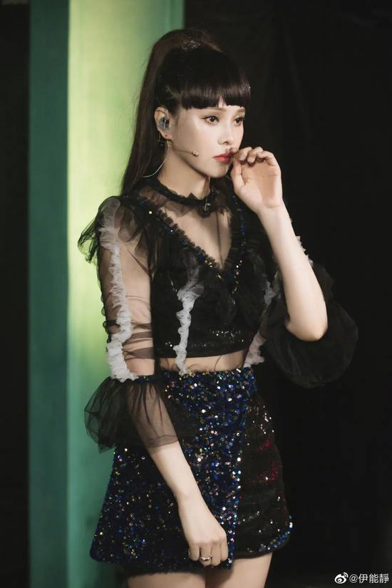 伊能静的初舞台选择了黑色套装,欧根纱荷叶边与黑色亮片包臀裙,平衡着可爱和性感,高马尾和假刘海则带来满满活力感。