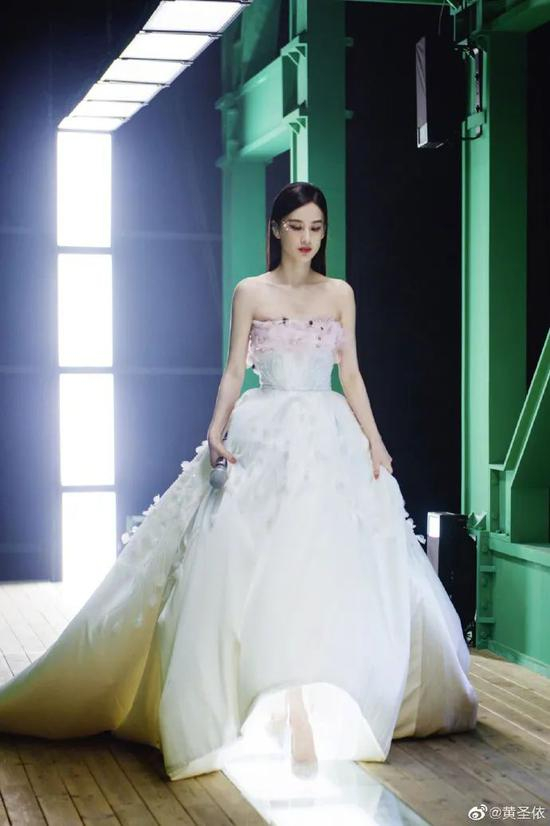 黄圣依的初舞台选择了白色抹胸长拖尾礼服作为战服,搭配温婉柔和的黑长直,眼角点缀大颗亮片。