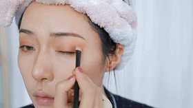 Step4:选择珠光橘色眼影在晕染在上眼皮前半段位置