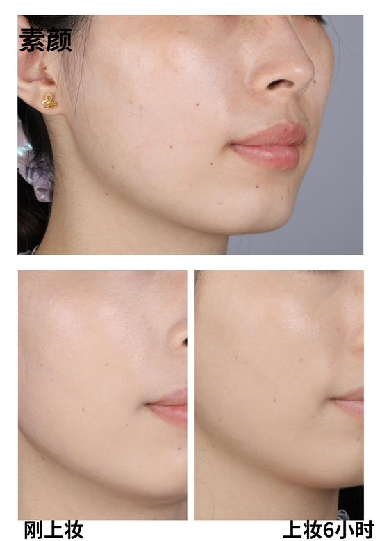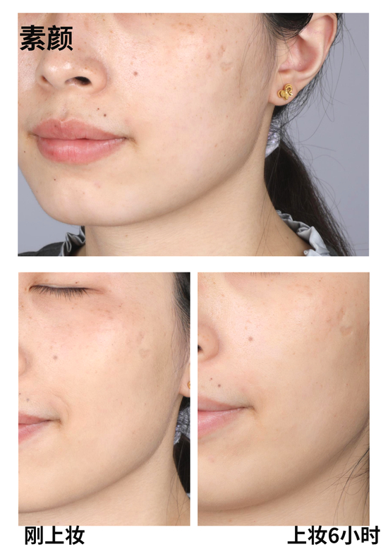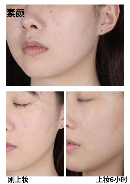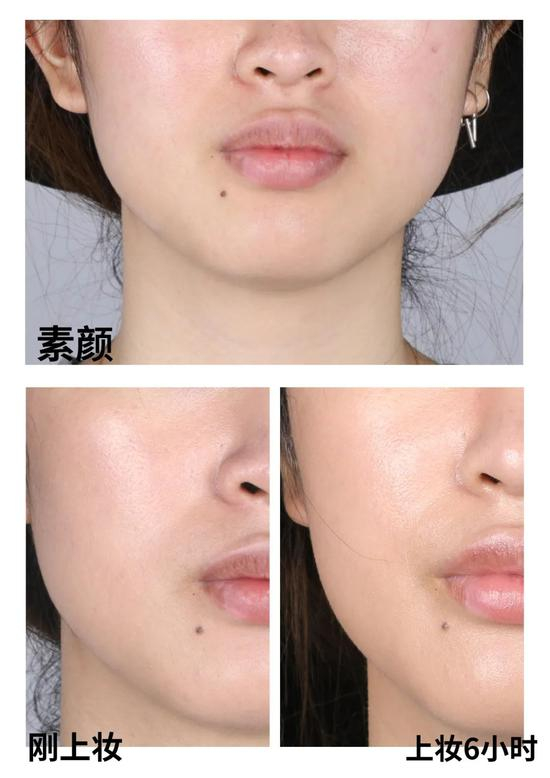 讲真,最近皮肤有点干的妹妹用这款粉底液时我还稍稍担心了。然而不管是刚上妆还是上妆6小时候后的效果,都还挺惊喜的。除了有一点轻微的氧化和出油,其他地方基本没啥问题。粉底液依然牢牢地扒在脸上,没有斑驳、浮粉的现象。