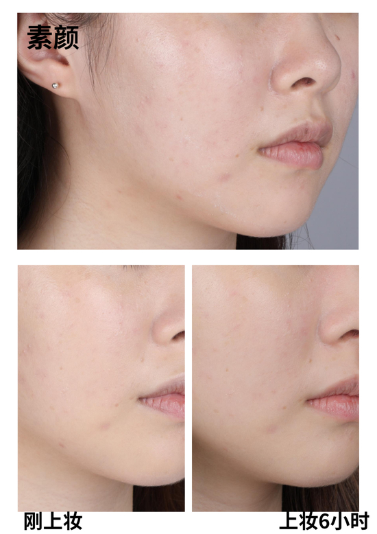 持妆力比我想象中的要好,待妆六小时后,没有出现卡粉、脱妆的情况,就是控油力不是很好。T区还有下巴的出油不仅没有被“压住”,反而因为它自带的光泽感,让脸子看起来更油了。干皮妹子可以考虑,油皮就有些不太适合了。