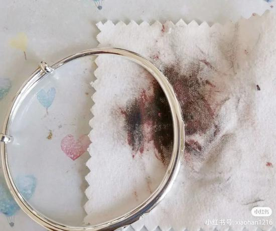 其实原理也很简单,银饰品之所以发黑,是因为银和空气中的硫发生反应产生了硫化银,而口红中的乳化剂刚好能让硫化银上浮,自然就变干净啦。