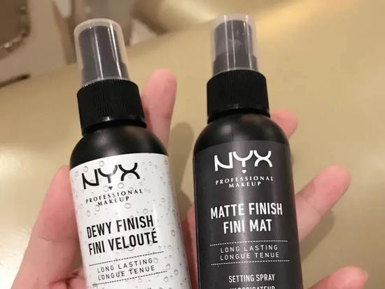 Nyx定妆喷雾,平价好用的代表!它有两种颜色,白色款适合干皮,比较滋润,还带有一点提亮效果~黑色款更适合油皮,控油效果更好!