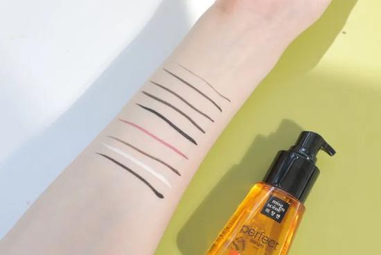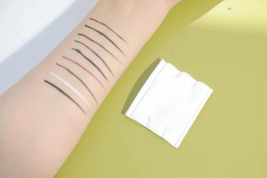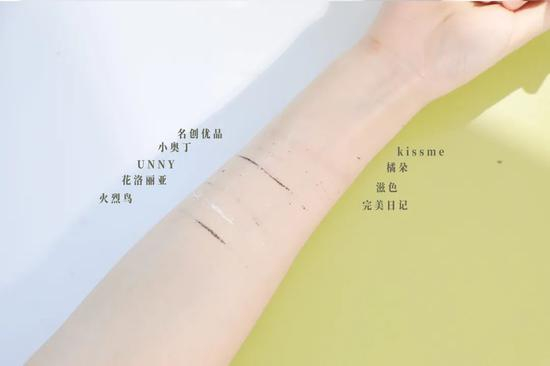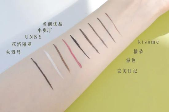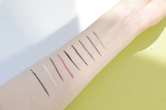 优秀的眼线液笔,笔头触感温和,显色均匀不结块。所以我将9支眼线液笔在胳膊上画竖线,想象在画眼线的场景来测顺滑度及显色度。