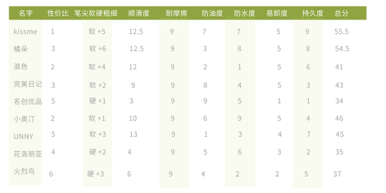 粗度排名:小奥汀>完美日记>UNNY>滋色>kissme>橘朵