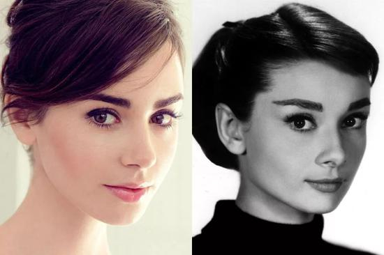 Lily Colins自从出道就一直有“小赫本”的称号,同样都有标志性的粗黑眉毛,都是气质复古的可人儿,眉眼间也确实有几分神似,而且Lily更能从里到外还原出赫本的神韵,甚至很多欧美网友说她是赫本的转世(这个有点夸张了,唯物主义者听了直摇头