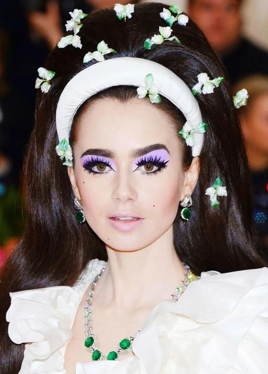 这种亮度极高的眼影颜色,即使是作为白肤星人也有很大出错的可能。但在Lily脸上表现出Drama的同时也带出了一份夸张的美感,搭配没什么存在感的底妆和唇妆格外有自己的风格。头饰上的装饰也让人眼前一亮,真的是有颜任性!