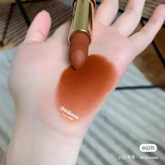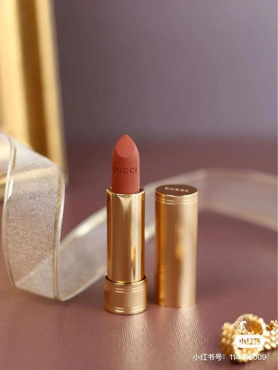 GUCCI这支口红的颜色很独特,是金棕色调的焦糖土棕色,像是深秋时节,在地上堆积起来的枫叶一样。