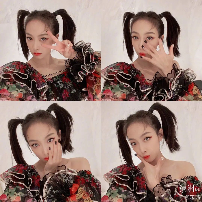 茜茜子最近pick的流星眉,特别适合她的脸型,加上双马尾,让妆容看上去精神十足。